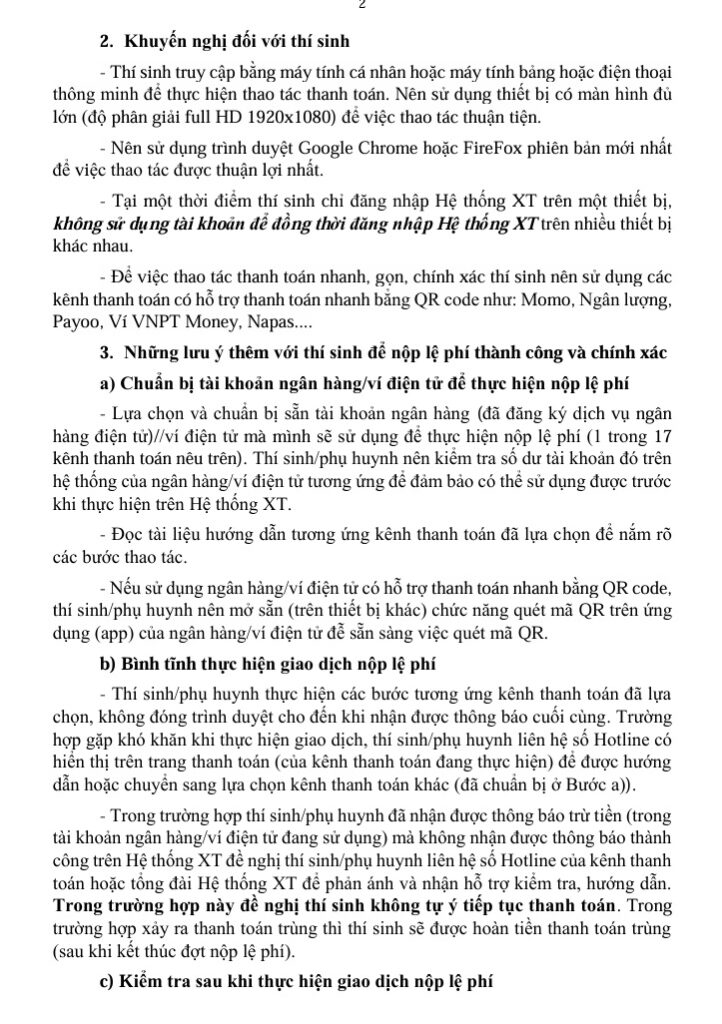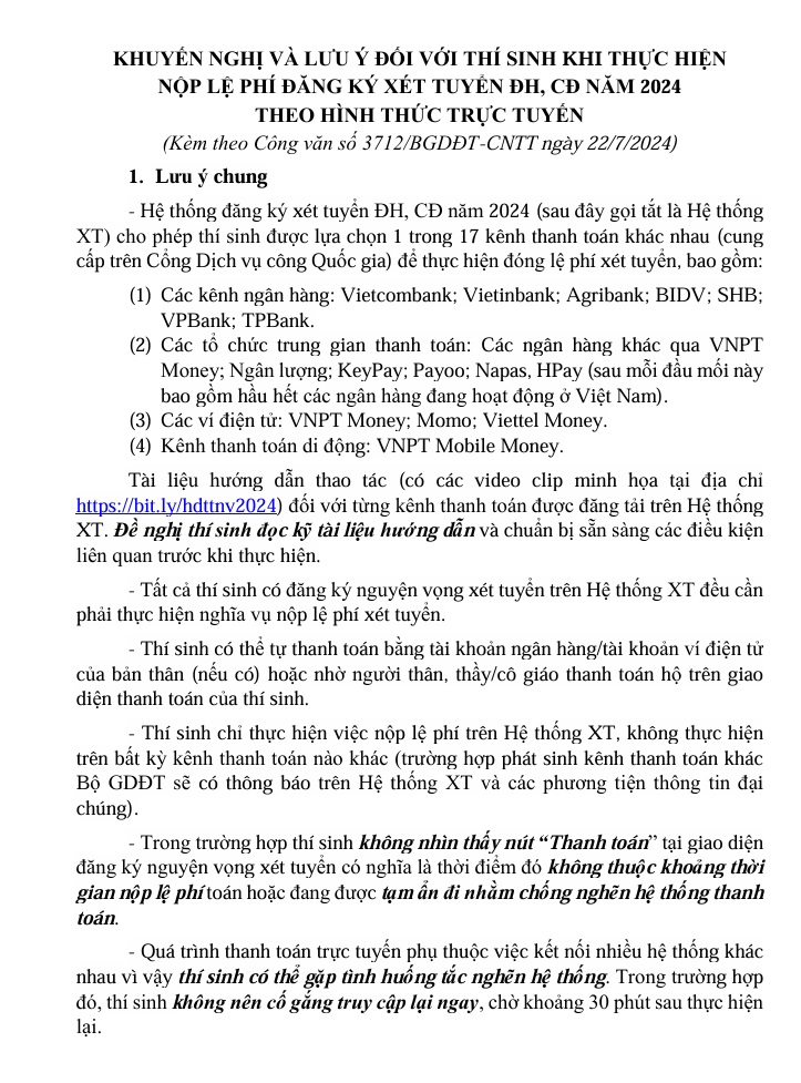 Khuyến nghị và lưu ý đối với thí sinh khi thực hiện nộp lệ phí đăng ký xét tuyển ĐH năm 2024