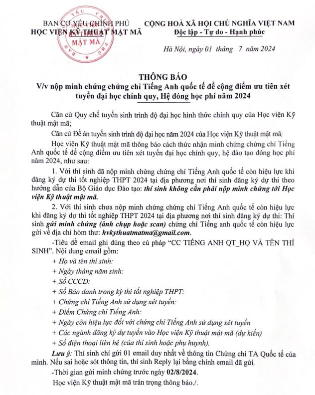 THÔNG BÁO NỘP MINH CHỨNG CHỨNG CHỈ TIẾNG ANH QUỐC TẾ ĐỂ CỘNG ĐIỂM ƯU TIÊN XÉT TUYỂN ĐẠI HỌC CHÍNH QUY, HỆ ĐÓNG HỌC PHÍ NĂM 2024.